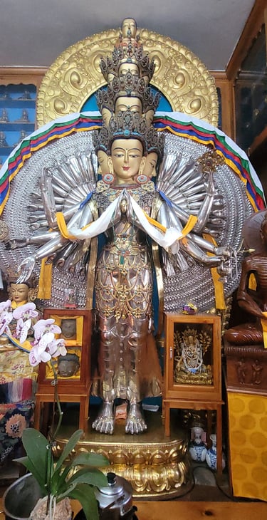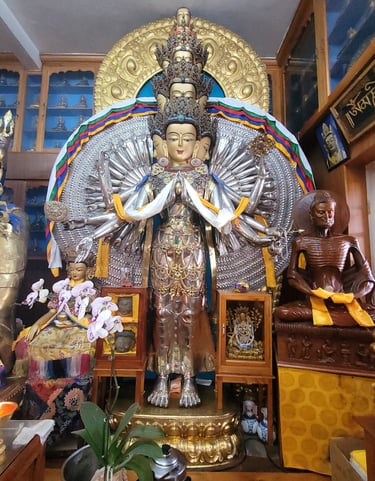Kora (Prayer Walk) - Circumambulation of the Dalai Lama's house located at the top of the hill. Kora is a sacred prayer walk in Tibetan Buddhism and Bon Tradition. It involves walking clockwise around a holy site - such as a temple, stupa, monastery, mountain, or lake as a form of pilgrimage, meditation, and devotion. This practice generates spiritual merit, purifies negative karma, and cultivates compassion and enlightenment. Pilgrims often enhance the kora by: Spinning prayer wheels (which contain rolled mantras), Chanting mantras (commonly "Om Mani Padme Hum"), Counting rosary beads (mala) or even full-body prostrations along the path.